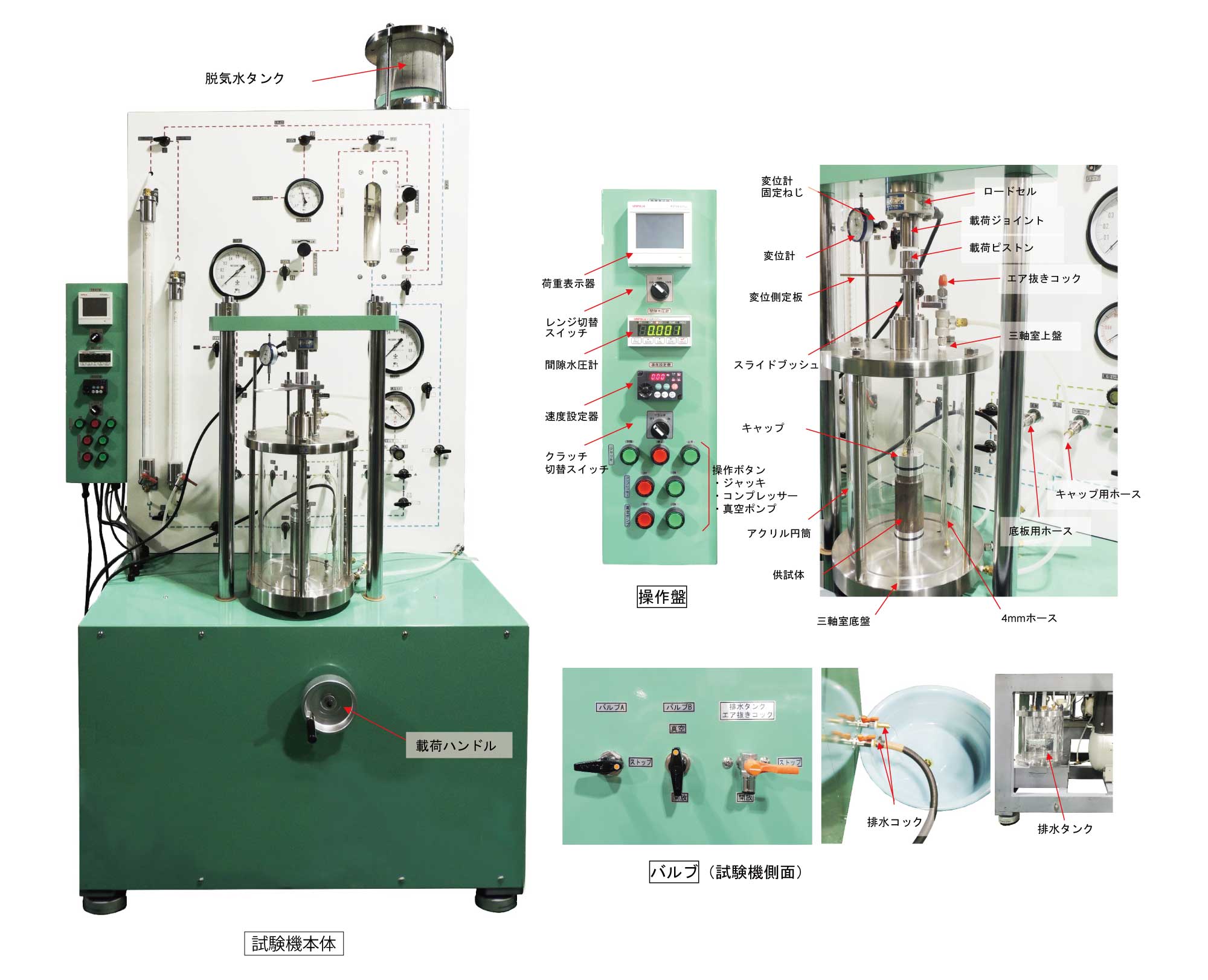 土質工学会の試験基準に準じて設計されており、UU・CU・CUバー・CDの各種三軸圧縮試験に対応可能です。