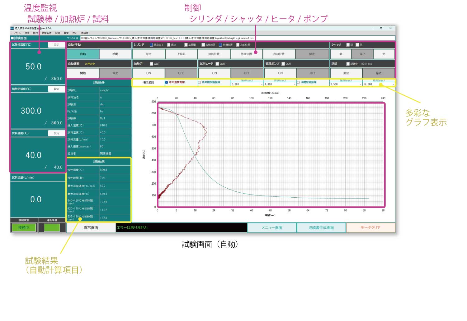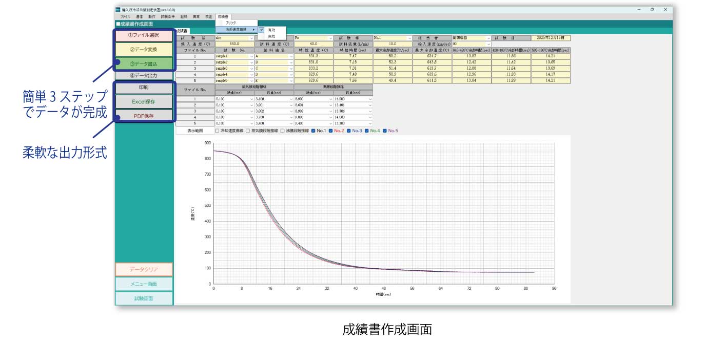 取得したデータは即座にグラフ化され、焼入性能の評価に必要な指標を自動計算します。