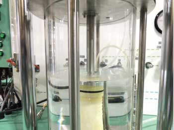 三軸室に供試体を入れ、水圧による側圧を加える。 |