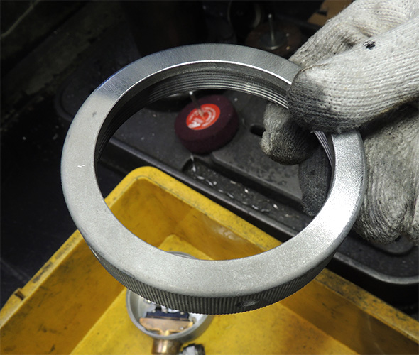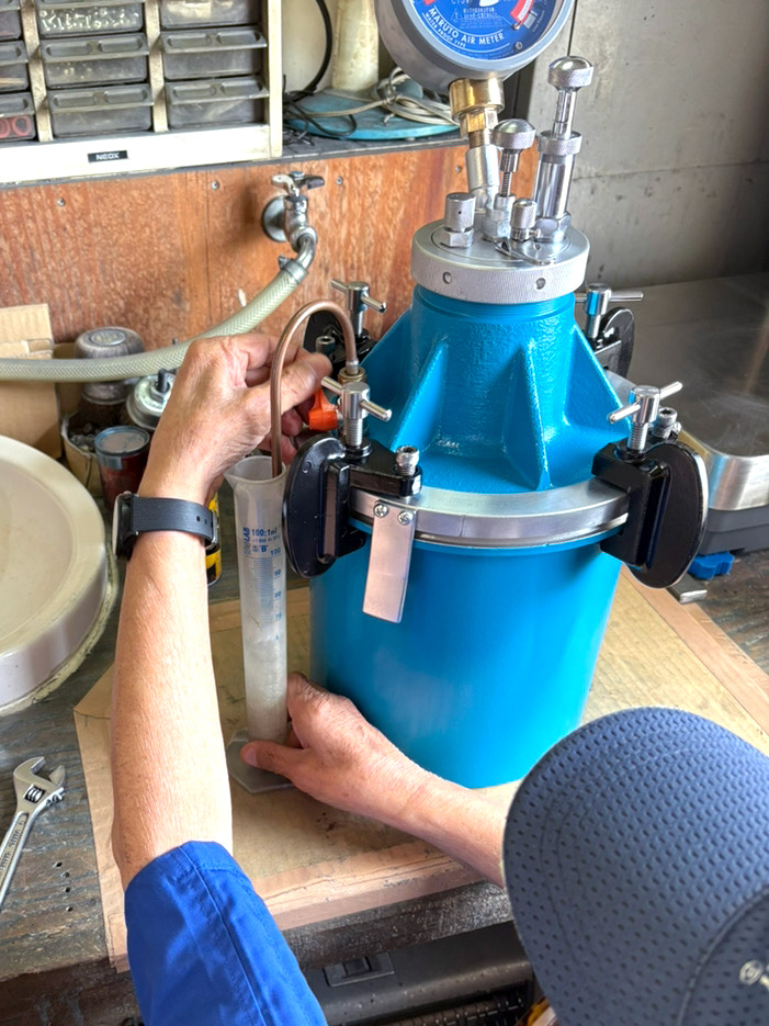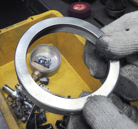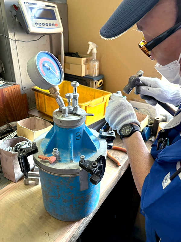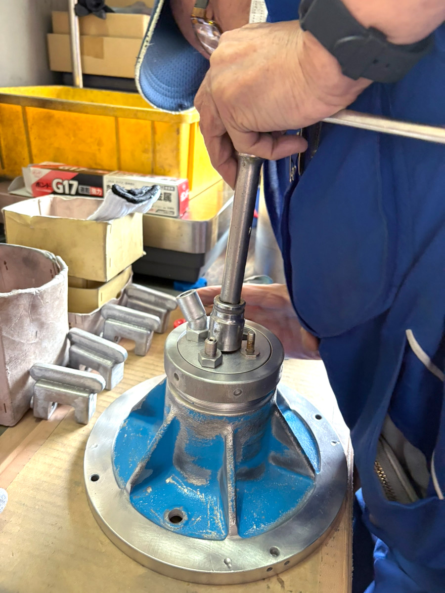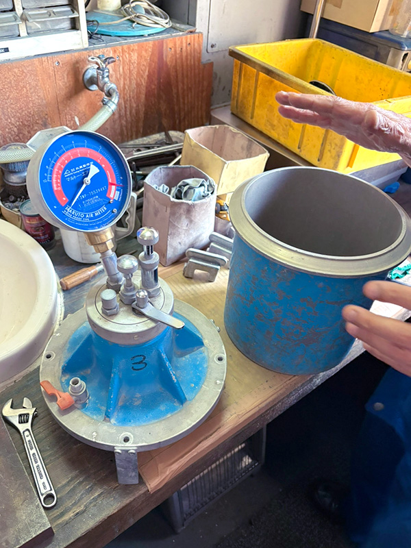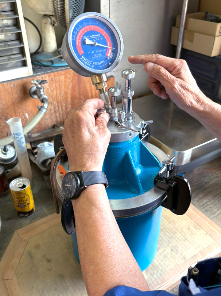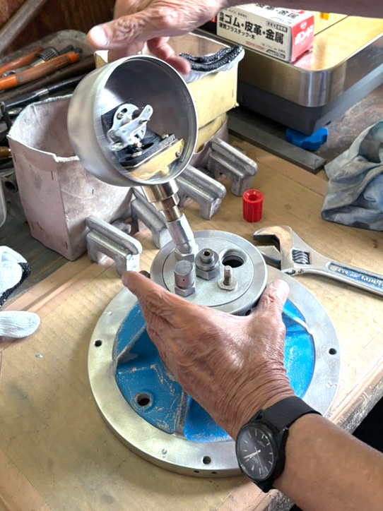 ダイヤルゲージの指針、ピストン部の動作確認を行います。