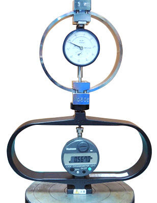 検定する力計と基準器を挟み、圧縮荷重を加えダイヤルゲージの変化量を読み取ります。