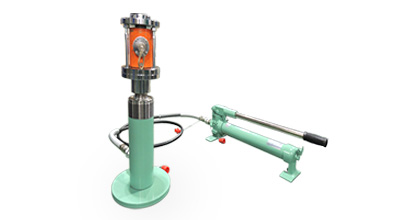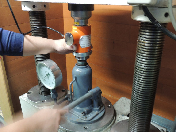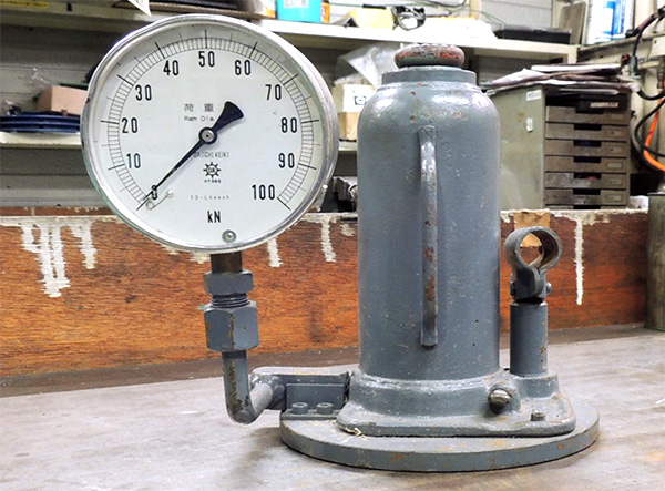 載荷枠に油圧ジャッキを載せます。その上に基準器を載せ、油圧ジャッキのポンプにて荷重をかけていきます。