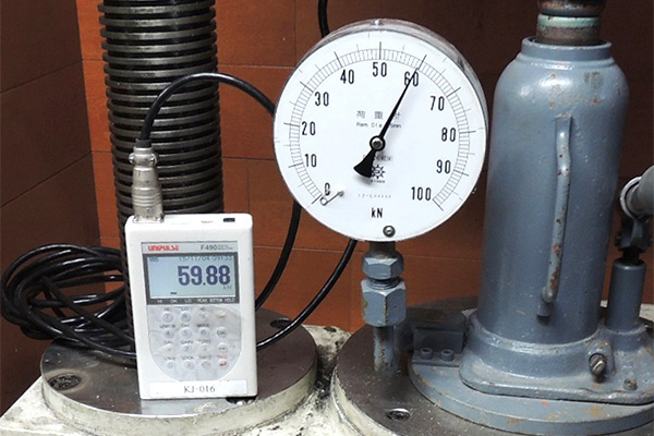 検定ロードセルに弊社表示器を接続します。検定ロードセルと基準器を重ねて、圧縮力を掛けていきます。