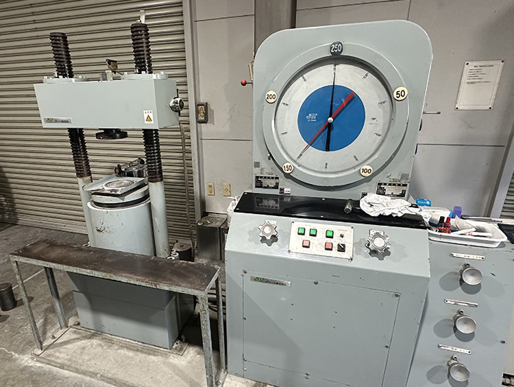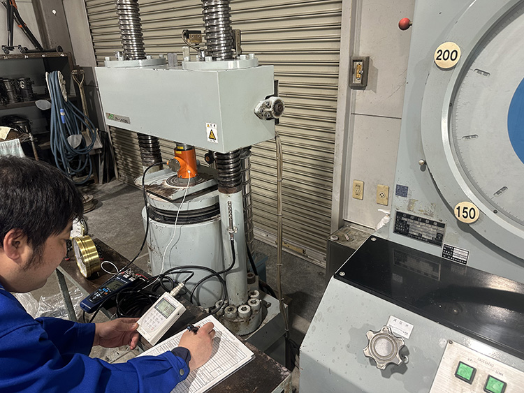 圧縮試験機を使用して検定を行います。